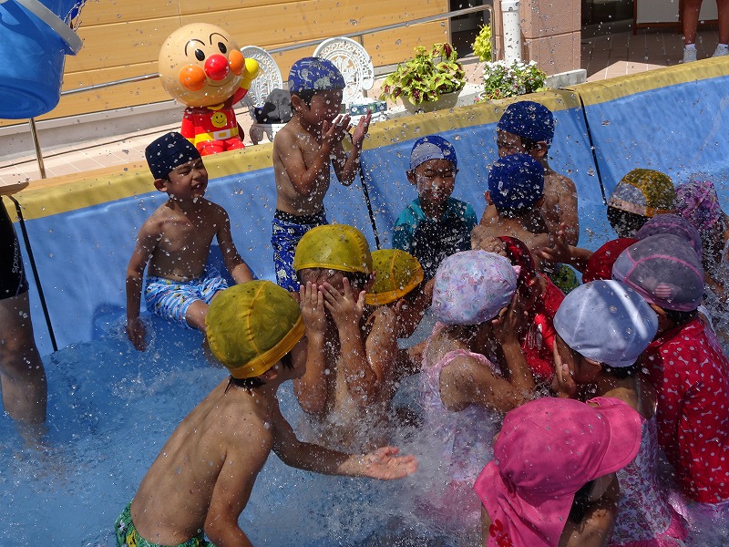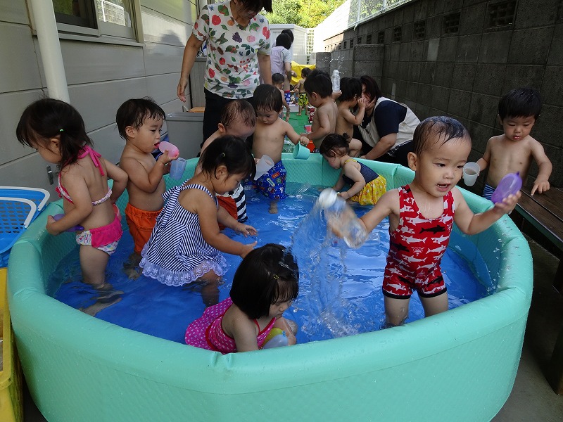 暑い夏はプールが気持ちいいですね!子どもたちも元気に体操をして、少しずつ水に慣れています。ひなぐみさんは少し小さめのプールに入りました\(^o^)/
